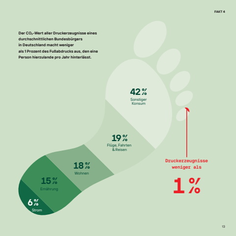 FAKT 4Der CO%u2082-Wert aller Druckerzeugnisse eines durchschnittlichen Bundesb%u00fcrgers in Deutschland macht weniger als 1 Prozent des Fu%u00dfabdrucks aus, den eine Person hierzulande pro Jahr hinterl%u00e4sst. 19 %Fl%u00fcge, Fahrten & Reisen42 %Sonstiger Konsum18 %Wohnen15 %Ern%u00e4hrung6 %Strom1 %Druckerzeugnisseweniger als13