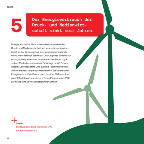 Energie ist kostbar. Nicht zuletzt deshalb arbeitet die Druck- und Medienwirtschaft seit vielen Jahren kontinuierlich an der Senkung ihres Energieverbrauchs. Zunehmend mehr Betriebe setzen zur Deckung ihres Bedarfs auf %u00f6kologische Quellen oder produzieren den Strom sogar selbst. Wir decken mit unserer PV-Anlage ca. 40%u00a0Prozent unseres Jahresbedarfs. Und auch die Papierfabriken setzen auf effizienzsteigernde Ma%u00dfnahmen. Sie konnten den Energieverbrauch in Deutschland um %u00fcber 30%u00a0Prozent von rund 3826 Kilowattstunden pro Tonne Papier im Jahr 1980 auf heute rund 2644%u00a0Kilowattstunden senken.5QuellenBundesverband Druck und Medien e. V.; Die Papierindustrie e. V.Der Energieverbrauch der Druck- und Medienwirtschaft sinkt seit Jahren. 14FAKT 5