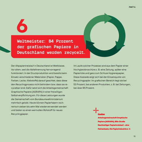 615FAKT 6Weltmeister: 84 Prozent der grafischen Papiere in Deutschland werden recycelt.Der Altpapierkreislauf in Deutschland ist Weltklasse. Vor allem, weil die Abfalltrennung hervorragend funktioniert. In der Druckproduktion wird bereits beim Einsatz verschiedener Materialien (Papier, Pappe, Farben, Lacke, Klebstoffe) darauf geachtet, dass diese den Recyclingprozess nicht behindern bzw. dass sie recycelbar sind. Daf%u00fcr setzt sich die Arbeitsgemeinschaft Graphische Papiere (AGRAPA) in einer freiwilligen Selbstverpflichtung ein. F%u00fcr diese Leistungen wurde die Gemeinschaft vom Bundesumweltministerium mehrfach gelobt. Heute k%u00f6nnen Papierfasern rechnerisch sieben bis zehn Mal wiederverwendet werden und bieten so einen wertvollen Rohstoff f%u00fcr neues Recyclingpapier.Im Laufe solcher Prozesse wird aus dem Papier einer Hochglanzbrosch%u00fcre z. B. eine Zeitung, sp%u00e4ter eine Papiert%u00fcte und ganz zum Schluss Hygienepapier. Diese Kaskade zeigt sich bei der Einsatzquote von Recyclingpapier. Im grafischen Bereich liegt sie bei 53 Prozent, bei anderen Produkten, z. B. bei Zeitungen, bei %u00fcber 85 Prozent.QuellenArbeitsgemeinschaft Graphische Papiere (AGRAPA), Bifa-Studie Nachhaltiger Papierkreislauf %u2013 eine Faktenbasis, Die Papierindustrie e. V.QuellenArbeitsgemeinschaft Graphische Papiere (AGRAPA), Bifa-Studie Nachhaltiger Papierkreislauf %u2013 eine Faktenbasis, Die Papierindustrie e. V.