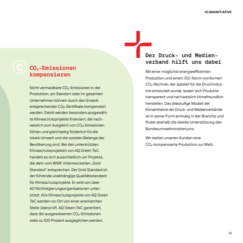 c CO%u2082-Emissionen kompensierenNicht vermeidbare CO%u2082-Emissionen in der Produktion, am Standort oder im gesamten Unternehmen k%u00f6nnen durch den Erwerb entsprechender CO%u2082-Zertifikate kompensiert werden. Damit werden besonders ausgew%u00e4hlte Klimaschutzprojekte finanziert, die nachweislich zum Ausgleich von CO%u2082-Emissionen f%u00fchren und gleichzeitig f%u00f6rderlich f%u00fcr die lokale Umwelt und die sozialen Belange der Bev%u00f6lkerung sind. Bei den unterst%u00fctzten Klimaschutzprojekten von AQ Green TeC handelt es sich ausschlie%u00dflich um Projekte, die dem vom WWF mitentwickelten %u201eGold Standard%u201c entsprechen. Der Gold Standard ist der f%u00fchrende unabh%u00e4ngige Qualit%u00e4tsstandard f%u00fcr Klimaschutzprojekte. Er wird von %u00fcber 60 Nichtregierungsorganisationen unterst%u00fctzt. Alle Klimaschutzprojekte von AQ Green TeC werden vor Ort von einer anerkannten Stelle %u00fcberpr%u00fcft. AQ Green TeC garantiert, dass die ausgewiesenen CO%u2082-Emissionen stets zu 100 Prozent ausgeglichen werden.Der Druck- und Medienverband hilft uns dabeiMit einer m%u00f6glichst energieeffizienten Produktion und einem ISO-Norm-konformen CO%u2082-Rechner, der speziell f%u00fcr die Druckindustrie entwickelt wurde, lassen sich Produkte transparent und nachweislich klimafreundlich herstellen. Das dreistufige Modell der Klimainitiative der Druck- und Medienverb%u00e4ndeist in seiner Form einmalig in der Branche und findet deshalb die ideelle Unterst%u00fctzung des Bundesumweltministeriums.Wir stellen unseren Kunden eine CO%u2082-kompensierte Produktion zur Wahl.19KLIMAINITIATIVE