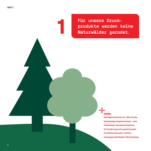 18FAKT 1F%u00fcr unsere Druckprodukte werden keineNaturw%u00e4lder gerodet.QuellenDie Papierindustrie e.V., Bifa-Studie Nachhaltiger Papierkreislauf %u2013 eine Faktenbasis, Bundesministerium f%u00fcr Ern%u00e4hrung und Landwirtschaft, Forstliche Versuchs- und Forschungsanstalt Baden-W%u00fcrttemberg